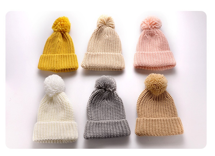 Boy and girl baby woolen hat, ball-shaped knitted hat, thick and warm winter hat for autumn and winter, cute candy-colored pure color hat